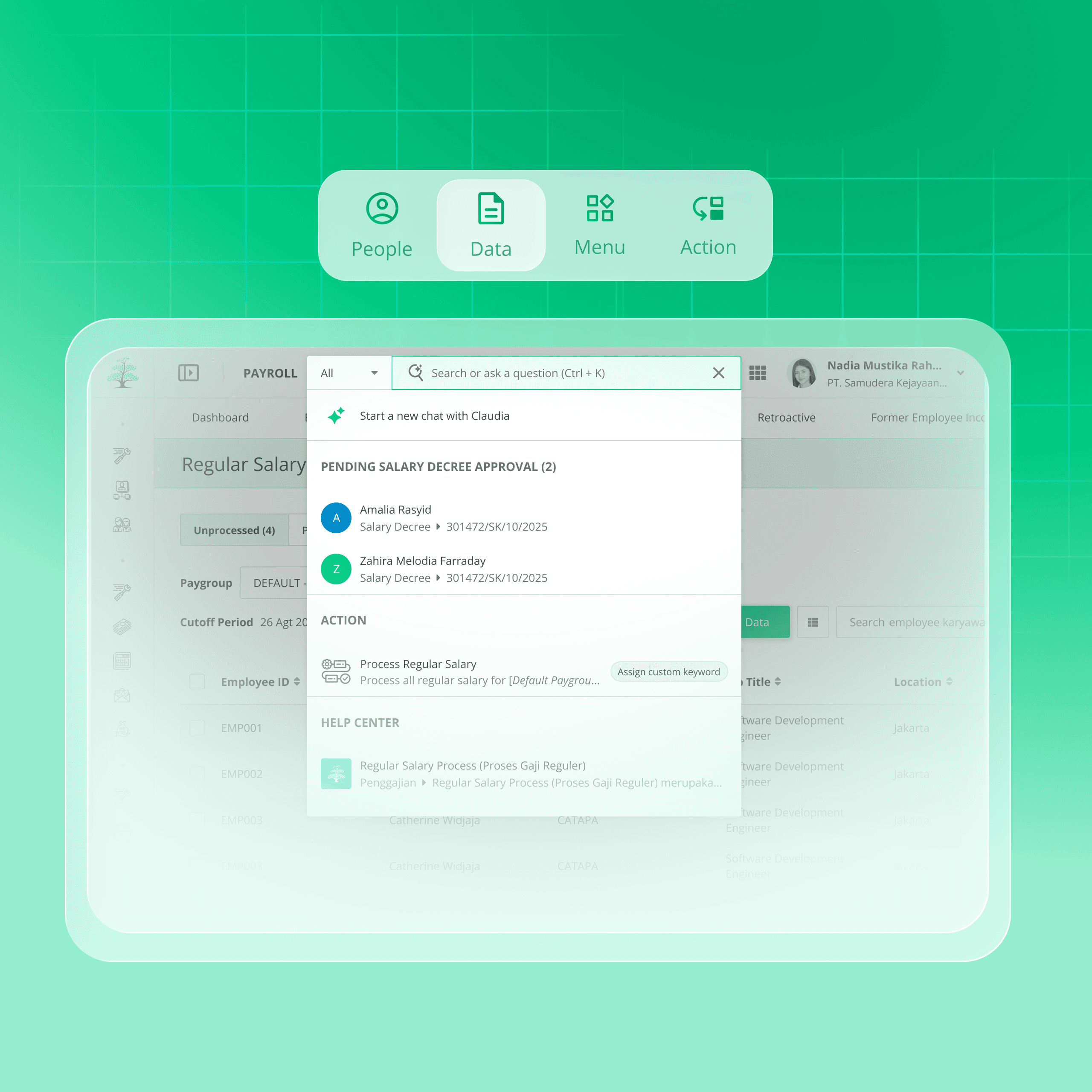 To replace passive search menu navigation with an active command center experience, unifying People, Actions, and Data into a single modal.