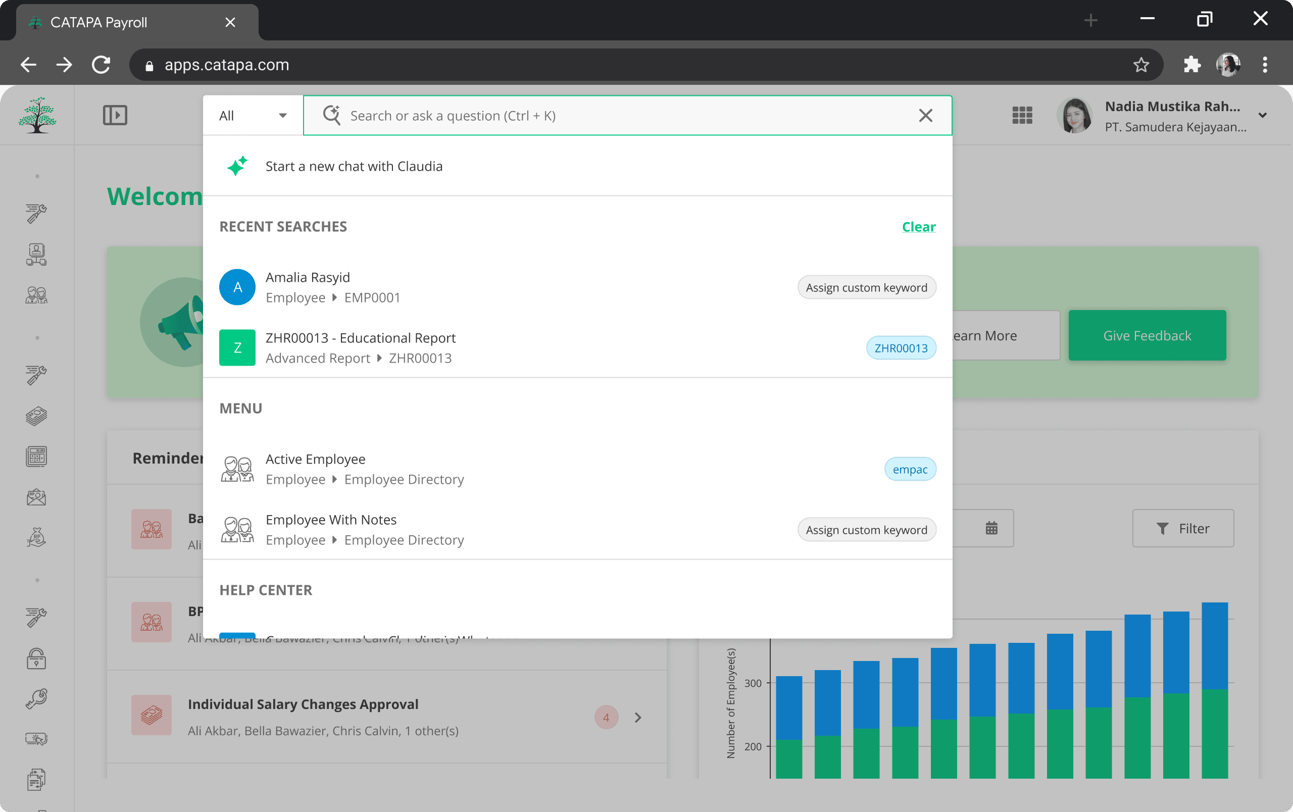 Contextual Results: If a user is on the "Payroll" page, searching for "Reports" prioritizes payroll-related documents over general HR reports