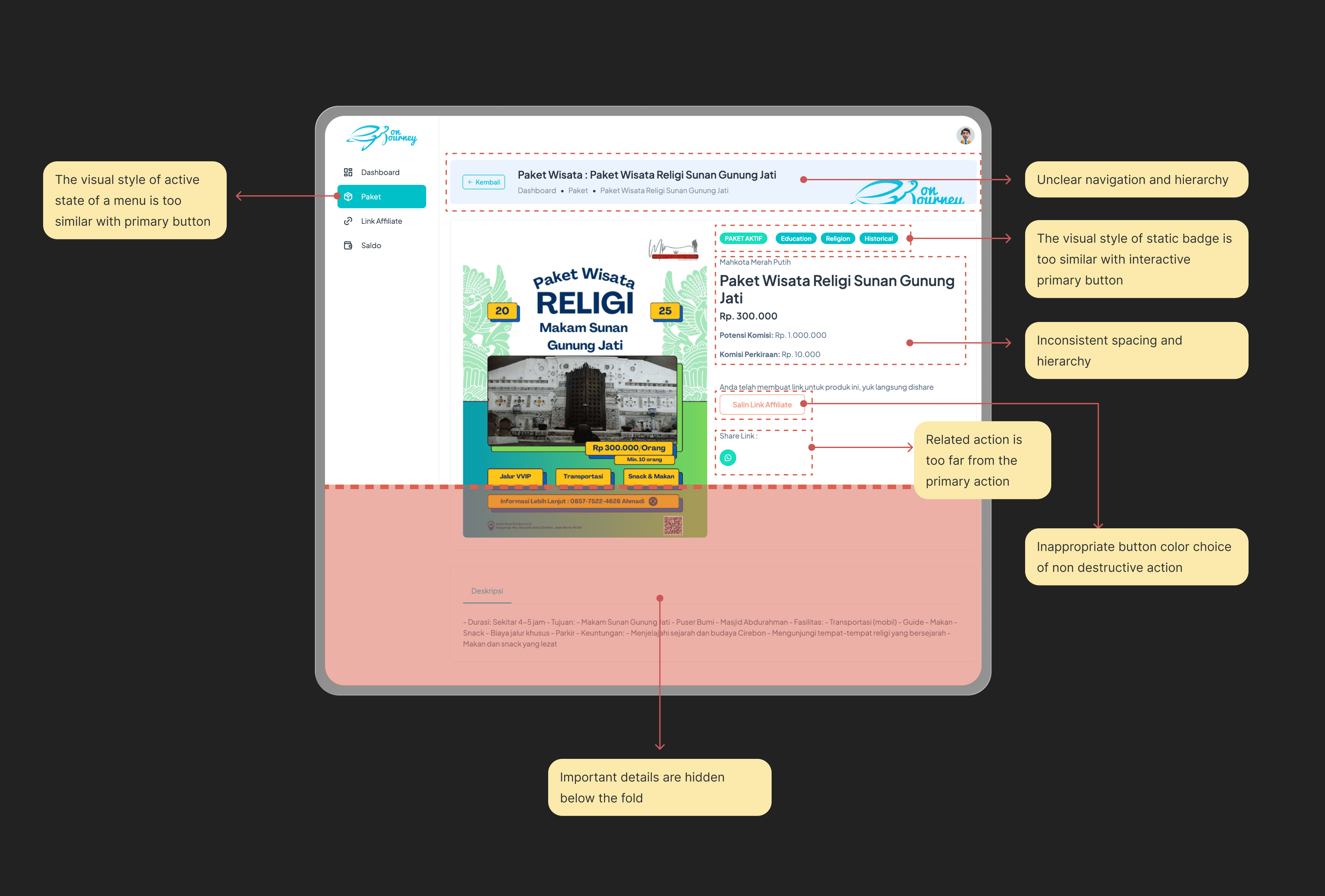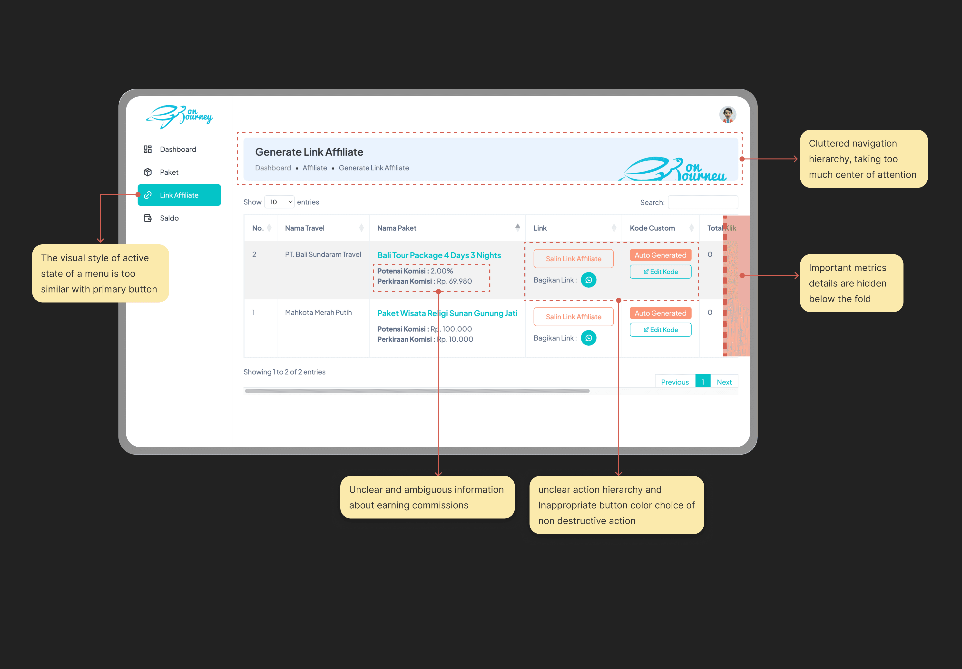Violations of Proximity: Related actions were spatially disconnected. The "Share to WhatsApp" button was isolated from the "Copy Link" button, breaking the natural workflow of the affiliate partners.